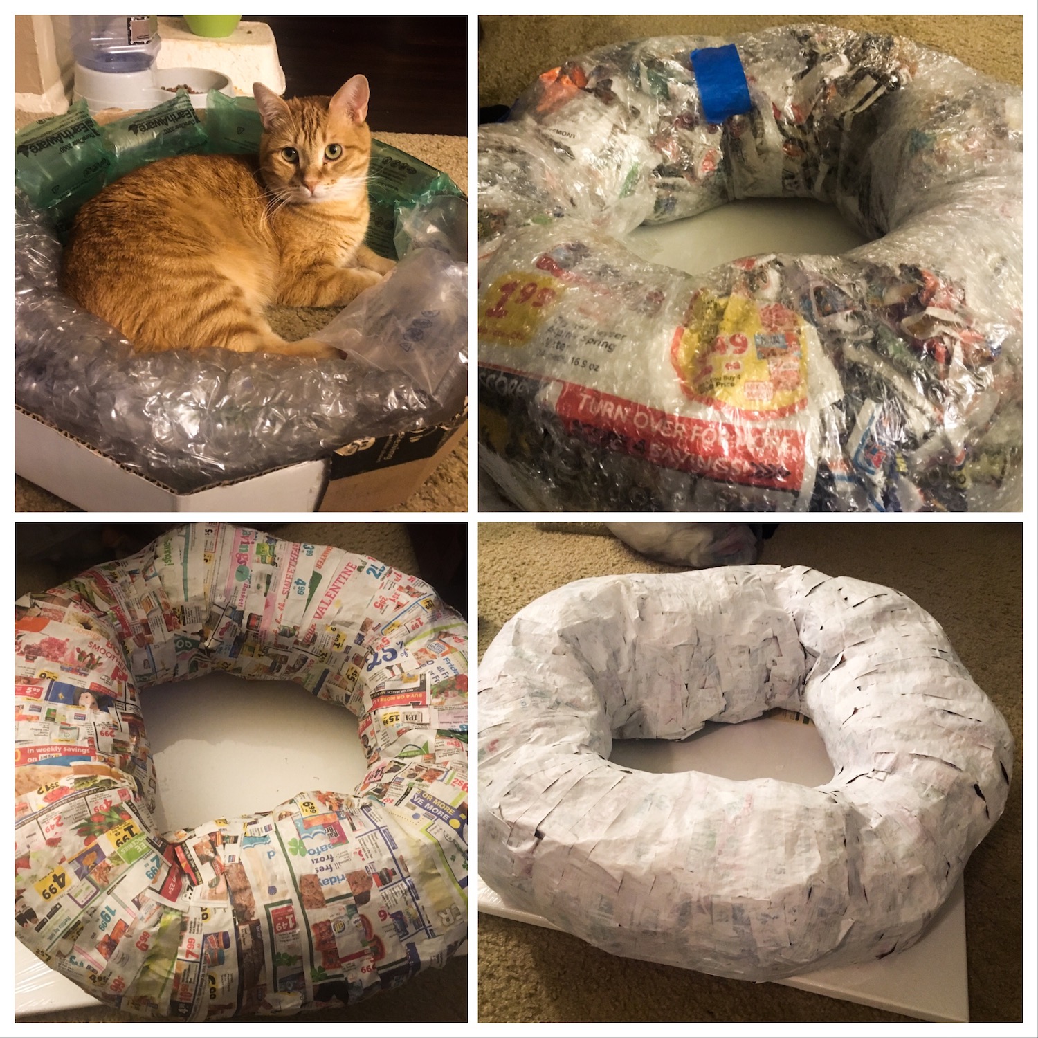 From top left to bottom right - I made the donut shape using a cardboard box and bubble wrap I had in the closet. Mr. Gold had one of those "if I fits, I sits" moments. Then I added another layer of paper and more bubble wrap. I glued the strips of paper I cut up last time. I never knew how many different types of glues I had around the house - Elmer's school glue, Modge Podge craft glue and even some sequin glue. I found another tube of cheap white paint in my art supplies so I used that for the primer layer. All of the materials used were found objects and supplies I have accumulated over the years. |